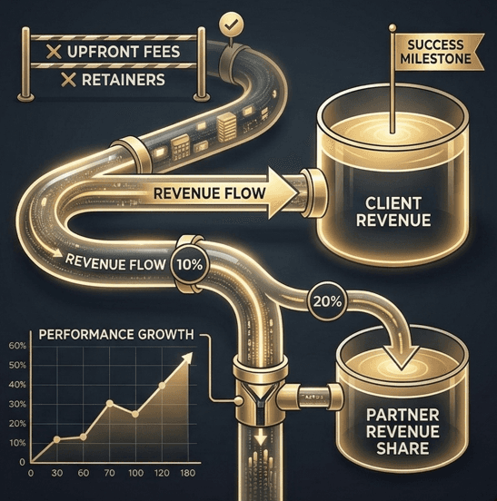 No retainers. No upfront fees. We take a revenue share tied to what the offer generates.